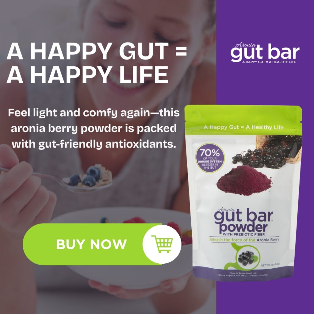 - Consume lots of high polyphenol foods…plant compounds that support healing and balance out the gut bugs. Aronia berries are among the highest in gut-friendly polyphenol compounds that are conveniently packed with massive amounts of antioxidants.